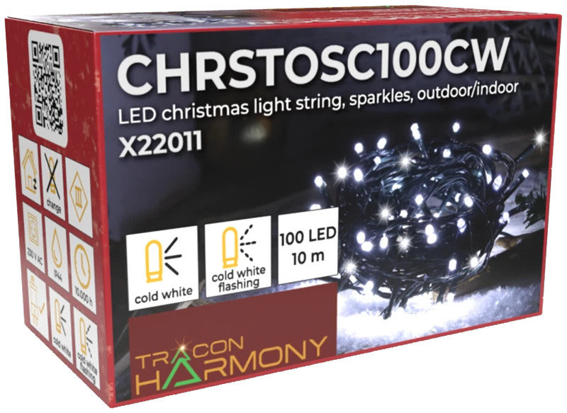 Tracon CHRSTOSC100CW Karácsonyi sziporkázó fényfüzér, kültéri/beltéri 230VAC, 2+10M, 100LED, 3,6W, hideg fehér ( 12000-13000K ) színhőmérséklettel, IP44 ( CHRSTOSC100CW )