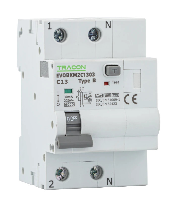 Tracon EVOBKM2B1003 Kombinált védőkapcsoló, 2P, 3modul, B karakterisztika B10A, 30 mA, 6kA, B