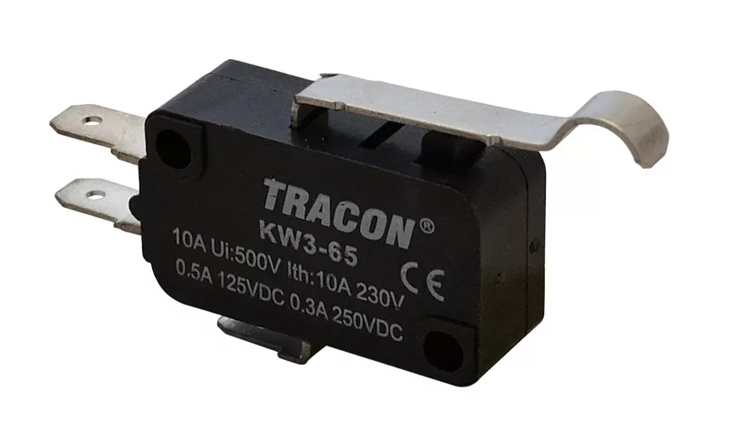 Tracon KW3-65 Helyzetkapcsoló, mikro, íves-rugószár 1×CO 10(3)A/230V, 28mm, 4,8x0,8 mm, IP00