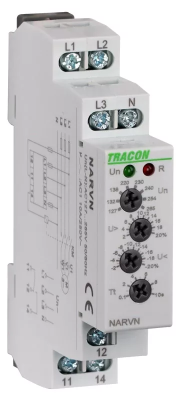 Tracon NARVN Feszültségfigyelő relé 3 fázisra AC 230V L-N, U>,< ,= +/-2-20%, t=0,1-10s, Asymm 8%