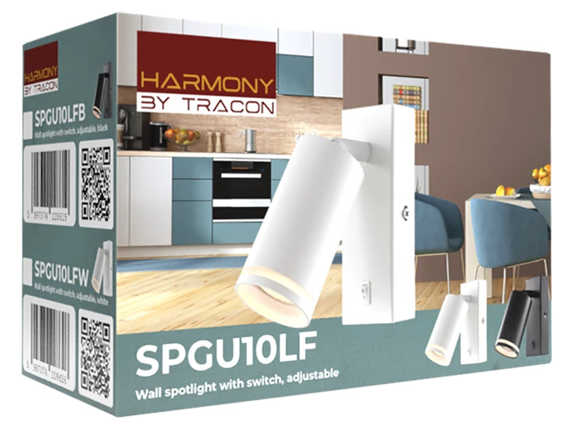 Tracon SPGU10LFB Oldalfali állítható spot lámpatest, fekete, kapcsolóval 100-240VAC, 50Hz, 1xGU10, max.35W