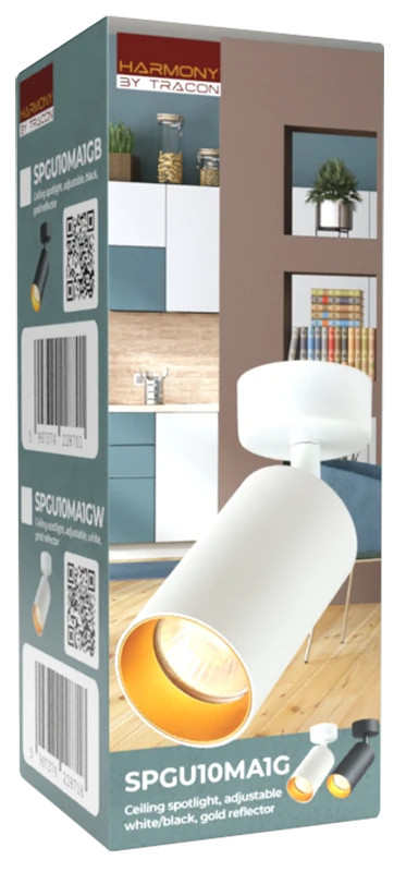 Tracon SPGU10MA1GB Mennyezeti állítható spot lámpatest, fekete, arany reflektor 100-240VAC, 50Hz, 1xGU10, max.35W