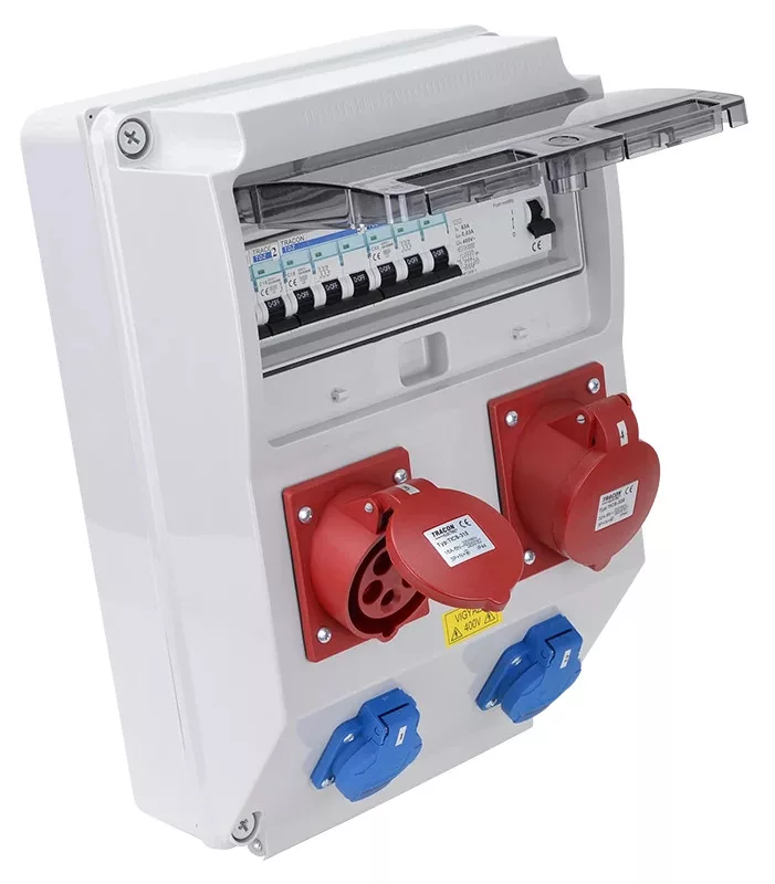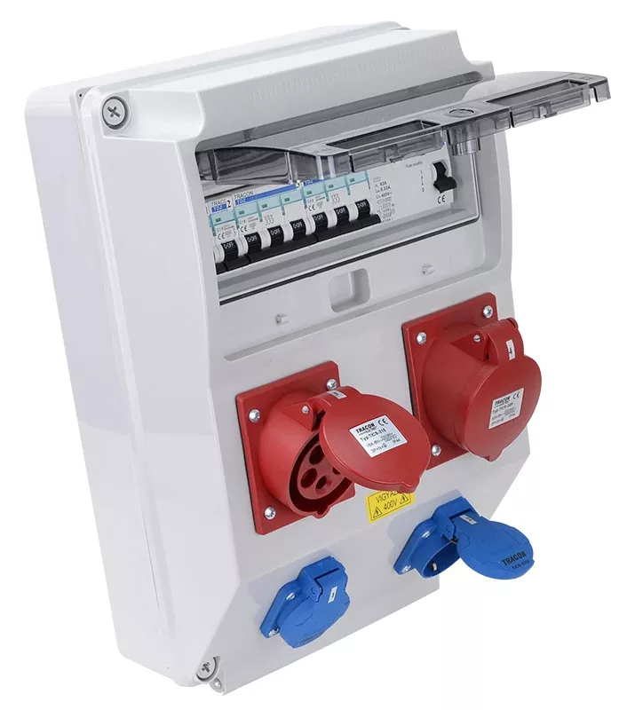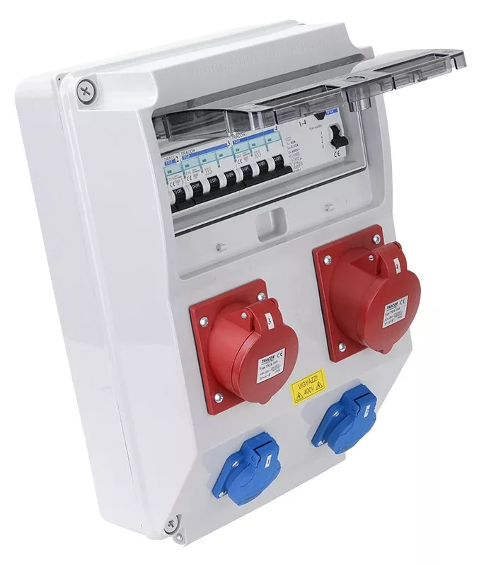 Tracon TDB12-12MV, Csatlakozó doboz védelemmel, vezetékezett, készre szerelt Prot.: RCCB, MCB Out: 2×SHUKO+1×32A(3P+N+E)+1×16A(3P+N+E)