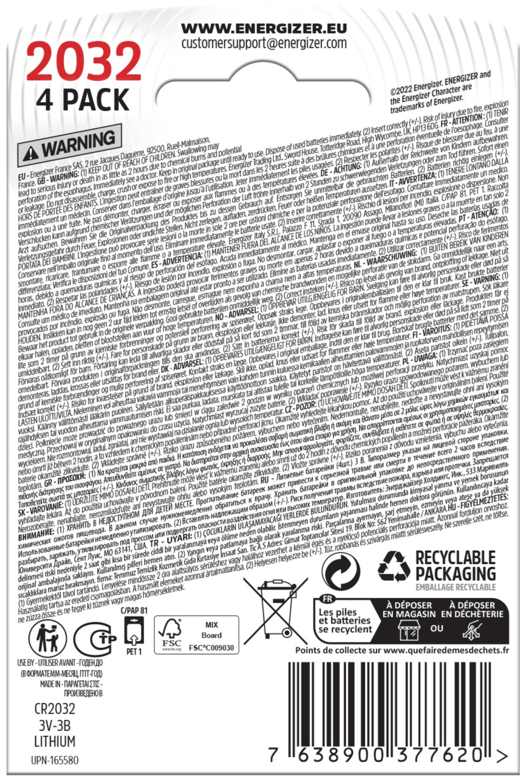 A csomag 4 darab (B4) Energizer CR2032 lítium gombelemet tartalmaz, amelyek azonnal használhatók bármely CR2032 kompatibilis eszközben.