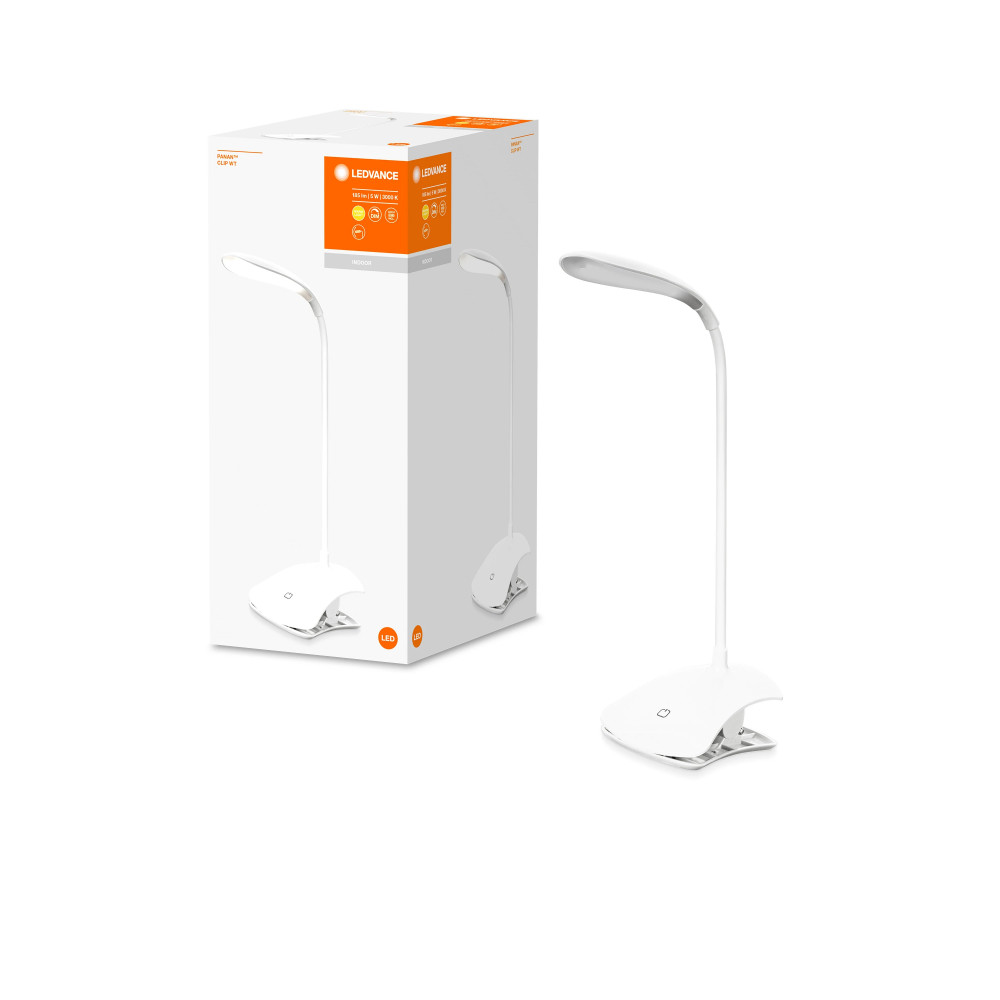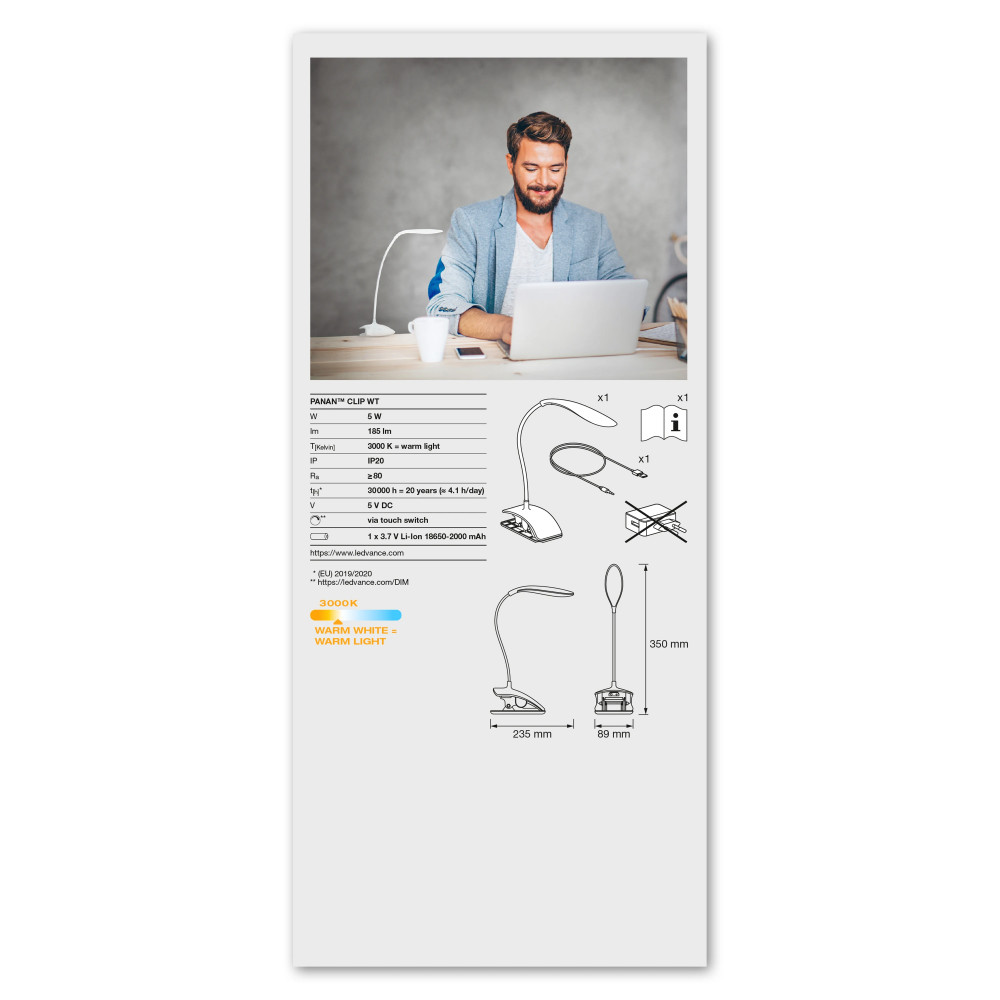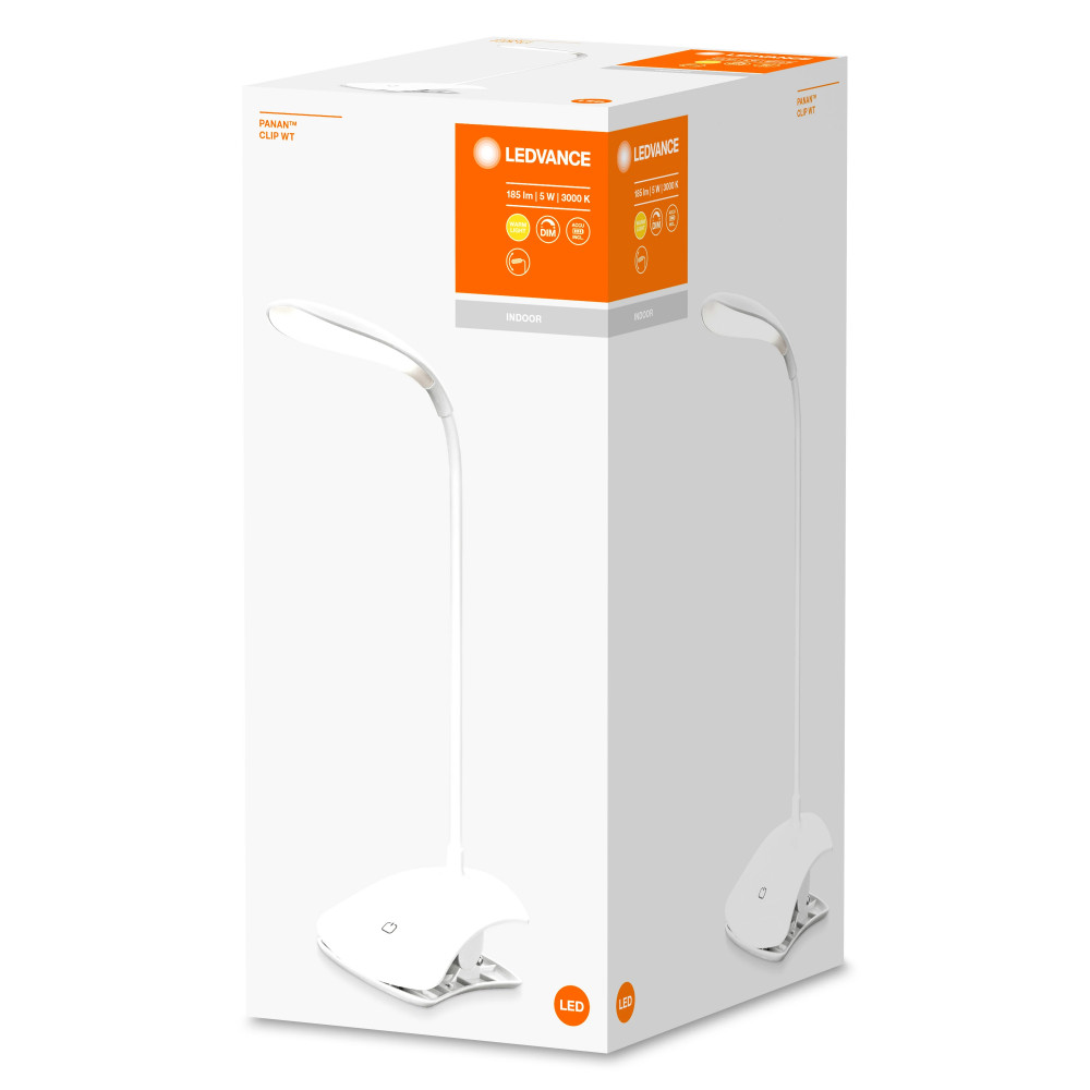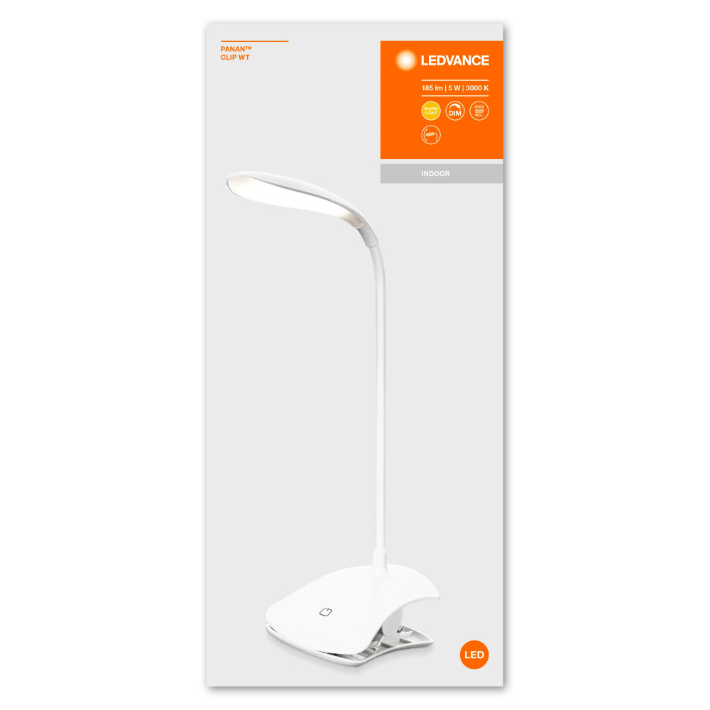 A(z) LEDVANCE PANAN Clip beltéri asztali lámpa fehér színben, 5 W fogyasztás mellett 185 lm fényerőt biztosít, 5 V DC USB táplálással, csipeszes (Clip) rögzítéssel.