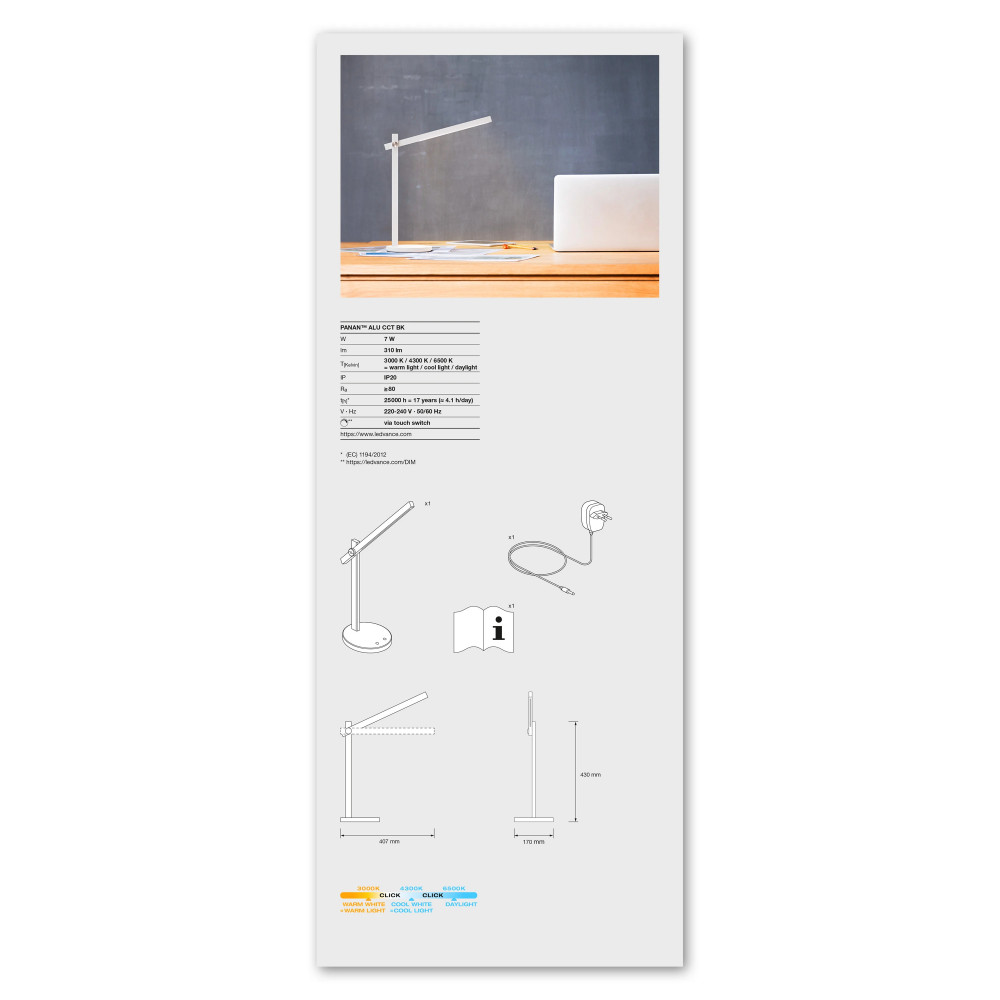 A(z) LEDVANCE PANAN Alu CCT beltéri asztali lámpa fekete színben, 7 W fogyasztás mellett 310 lm fényerőt biztosít, alumínium (Alu) házzal, CCT állítható színhőmérséklettel (3000-6500 K).