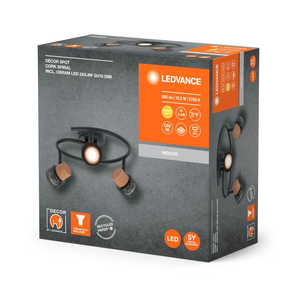 A(z) LEDVANCE Decor Spot Cork mennyezeti spot lámpa fekete színben, 3 spotos, 10,2 W fogyasztás mellett 690 lm fényerőt biztosít, parafa (Cork) dekoratív elemmel, GU10 foglalattal.