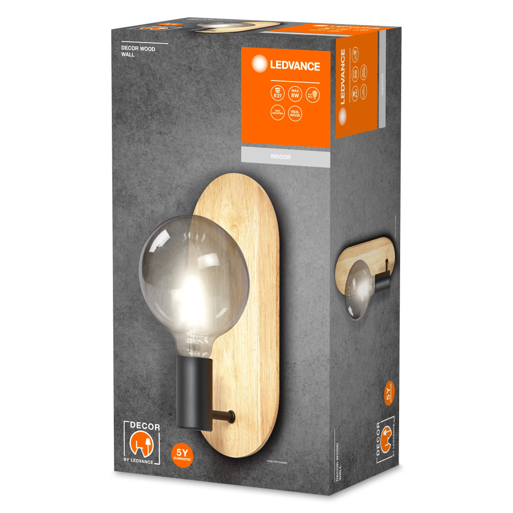 A(z) LEDVANCE Decor Wood beltéri lámpatest fadekor/fekete színben, 300 mm magassággal, E27 foglalattal, természetes fa-hatású dizájnnal.
