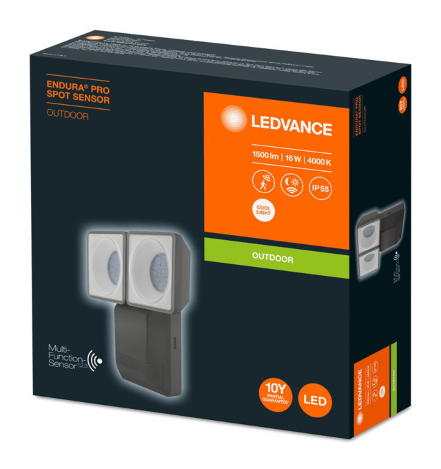 A LEDVANCE LEDVANCE ENDURA PRO SPOT SENSOR DG, kültéri, sötétszürke LED reflektor fény- és mozgásérzékelővel, 16W, IP55, 4000K, 1500lm, hossz: 177mm egy LED spot fényforrás. 4000 K meleg fehér fényével.