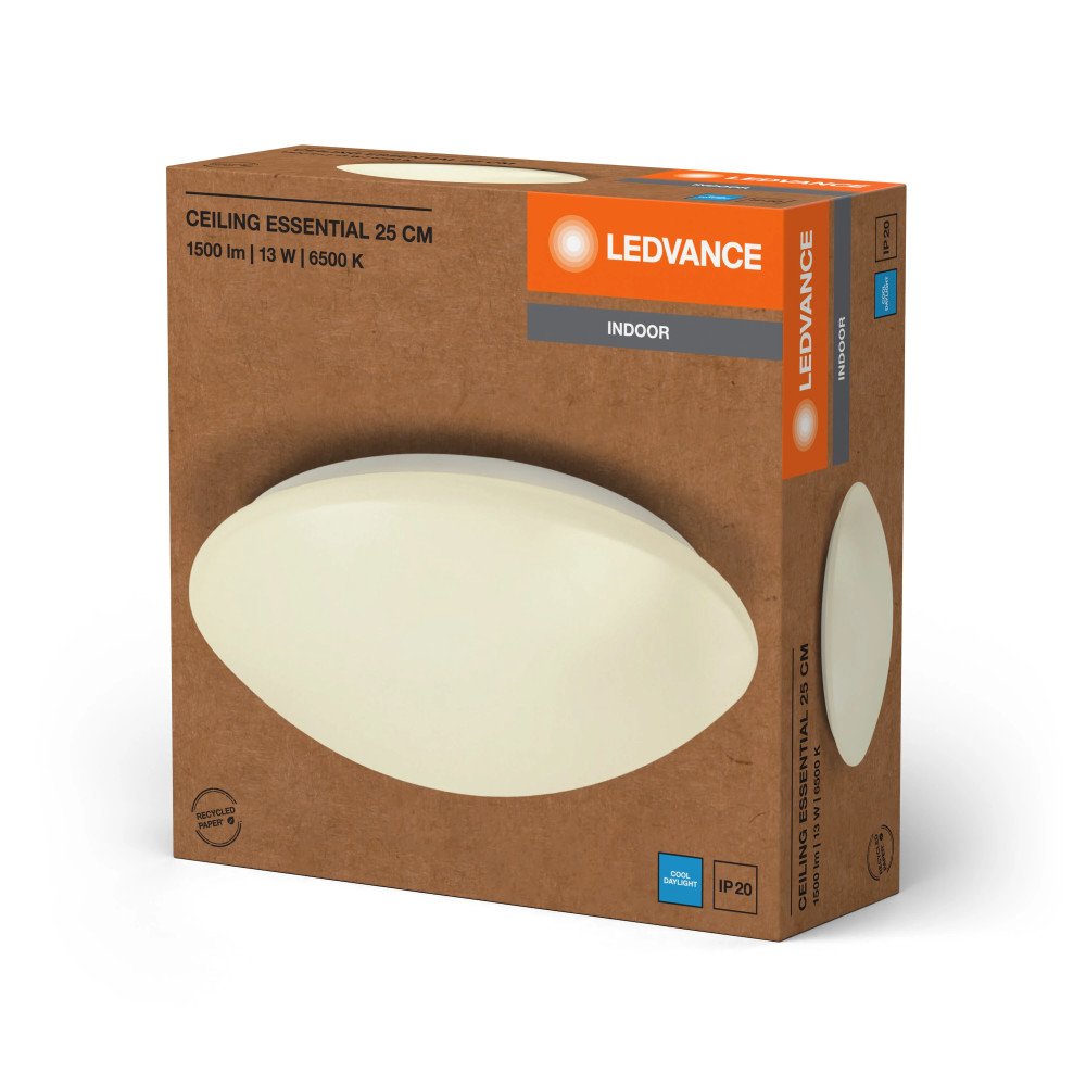 A(z) LEDVANCE Essentials Ceiling beltéri mennyezeti lámpatest fehér színben, 13 W fogyasztás mellett 960 lm fényerőt biztosít, napfény fehér fénnyel.