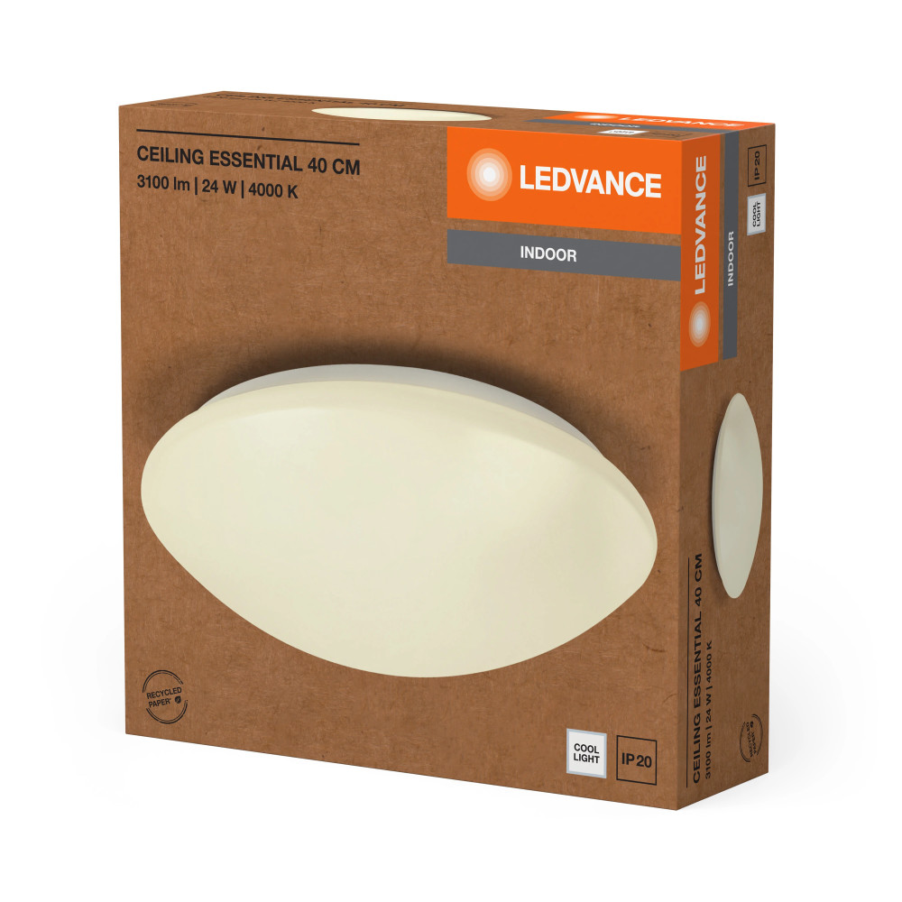 A(z) LEDVANCE Essentials Ceiling beltéri mennyezeti lámpatest fehér színben, 24 W fogyasztás mellett 1920 lm fényerőt biztosít, természetes fehér fénnyel, 120 mm átmérővel.