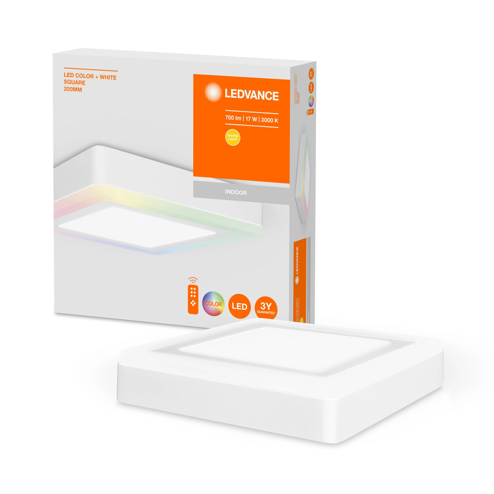 A(z) LEDVANCE LED COLOR + WHITE beltéri mennyezeti vagy fali lámpa fehér színben, 17 W fogyasztás mellett 700 lm fényerőt biztosít, mellékelt távirányítóval vezérelhető fehér és színes (RGB) üzemmóddal.