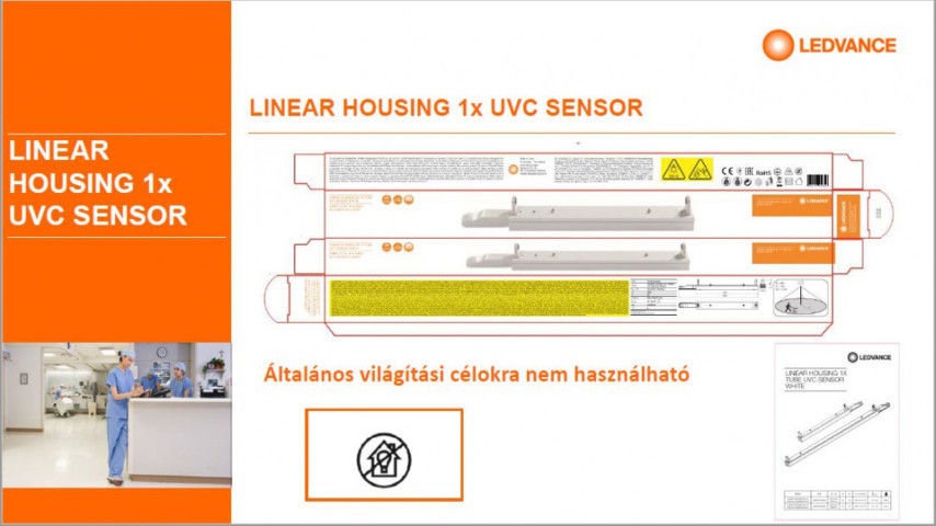 A LEDVANCE LEDVANCE UVC fertőtlenítő lámpatest jelenlét érzékelővel, 1 x 15W, 30 mp-es késleltetett indítással, fényforrás (izzó) nélkül, G13-as foglalattal, LINEAR HOUISNG 440 1xTUBE UVC SENSOR egy lámpatest..