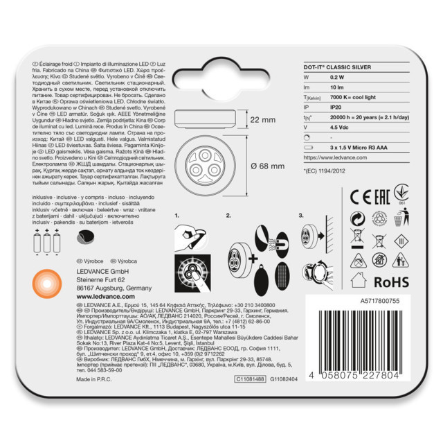 A LEDVANCE LEDVANCE DOT-it CLASSIC Silver, beltéri, ezüst átmérő: 68mmjű ezüst LED lámpa, 3xAAA elemmel, 0.23W, 7000K, 10lm, IP20 egy világítási termék. 7000 K meleg fehér fényével.