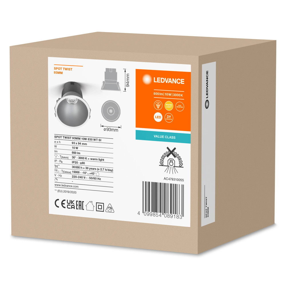 A(z) LEDVANCE LED SPOT RECESS TWIST PRO beltéri süllyesztett lámpatest fehér/ezüst színben, 10 W fogyasztás mellett 800 lm fényerőt biztosít, meleg fehér fénnyel, 94 mm átmérővel, csavaros (Twist) rögzítéssel.