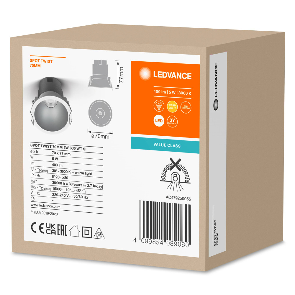 A(z) LEDVANCE LED SPOT RECESS TWIST PRO beltéri süllyesztett lámpatest fehér/ezüst színben, 5 W fogyasztás mellett 400 lm fényerőt biztosít, meleg fehér fénnyel, 77 mm átmérővel, csavaros (Twist) rögzítéssel.