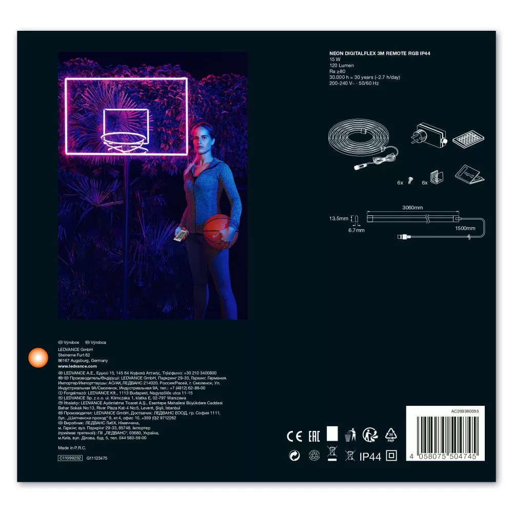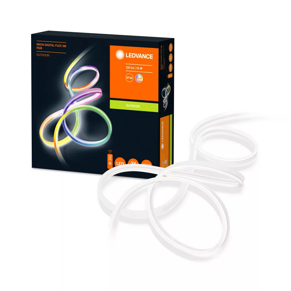 A(z) LEDVANCE NEON DIGITAL FLEX kültéri LED szalag, 15 W fogyasztás mellett 120 lm fényerőt biztosít, 3 m hosszúsággal, RGB színes fénnyel, IP44 védelemmel, neon-hatású fénysávval.