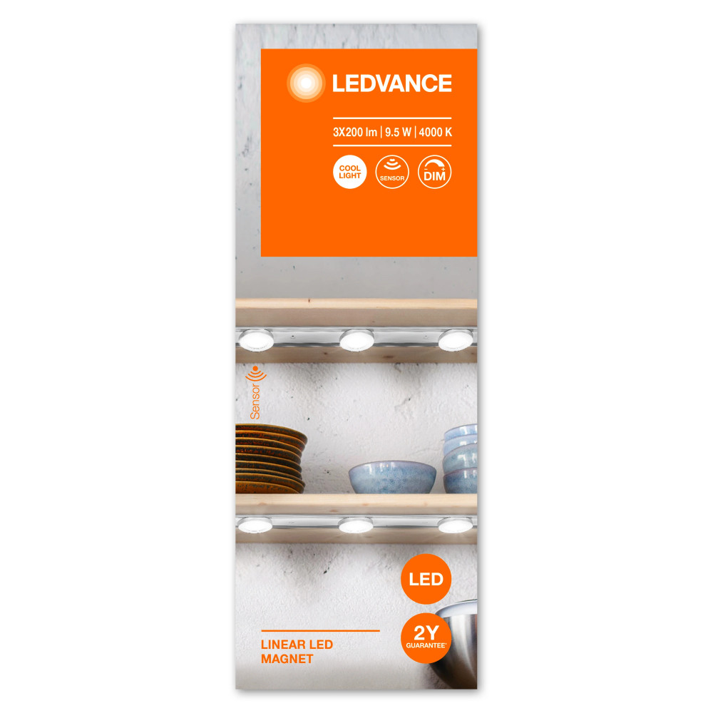 A(z) LEDVANCE LINEAR LED MAGNET beltéri bútor alatti pultmegvilágító lámpa fehér színben, 9,5 W fogyasztás mellett 600 lm fényerőt biztosít, mágneses rögzítéssel, természetes fehér fénnyel.