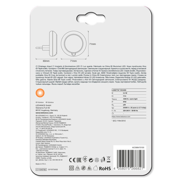 A LEDVANCE LEDVANCE LUNETTA Round White, beltéri, fehér átmérő: 71mmjű éjszakai LED lámpa fényérzékelővel + kapcsoló dugaljba dugható kivitel, 0.3W, IP20, 3000K, 3lm egy okos dugalj. 3000 K meleg fehér fényével.