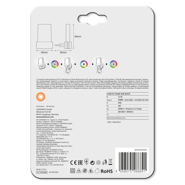 A LEDVANCE LEDVANCE LUNETTA Shine RGB White, beltéri, fehér éjszakai LED lámpa alkonykapcsolóval, 0.28W, 2700-6000K, fényerő, IP20 egy okos kapcsoló. 6000 K meleg fehér fényével.