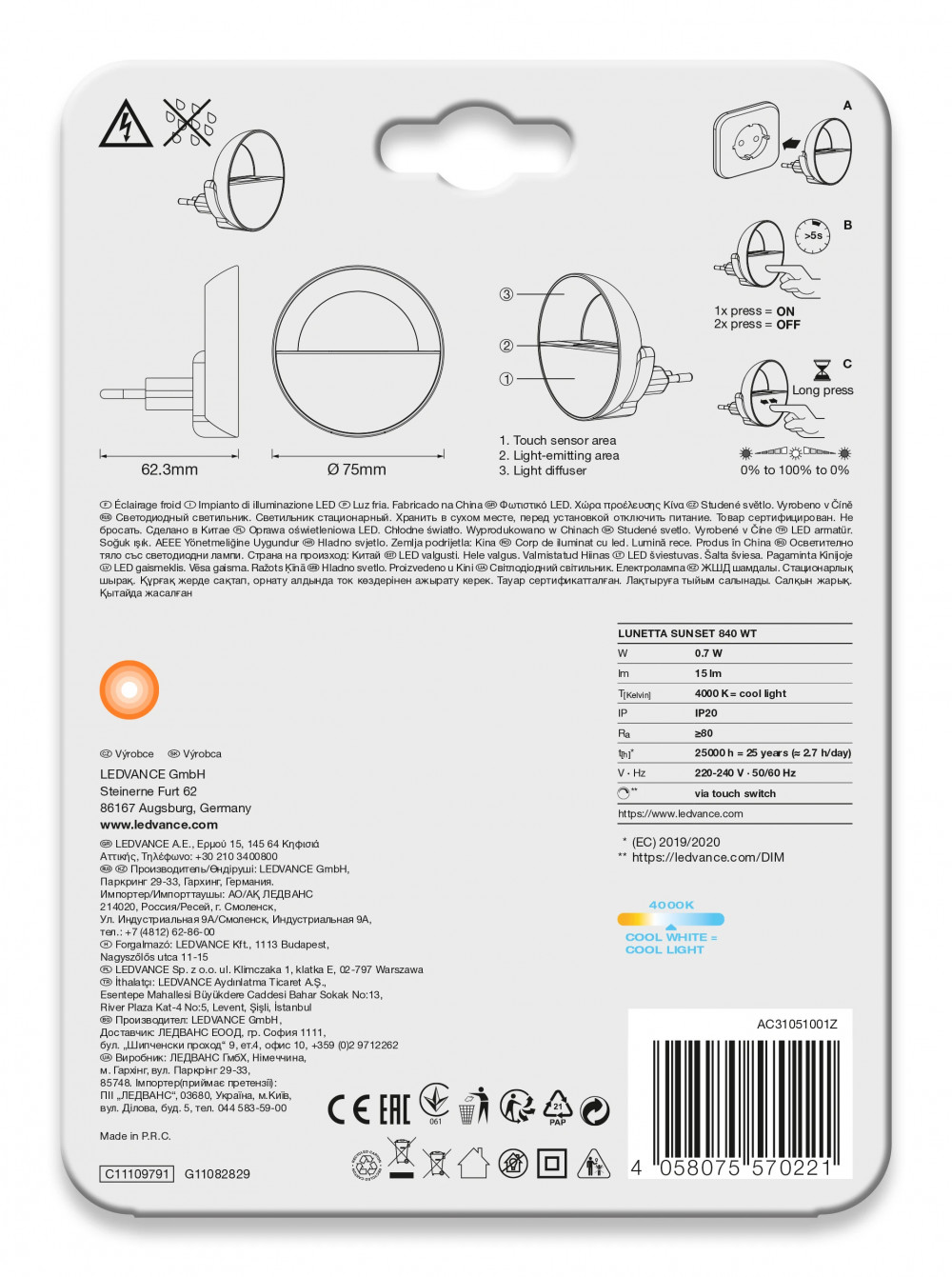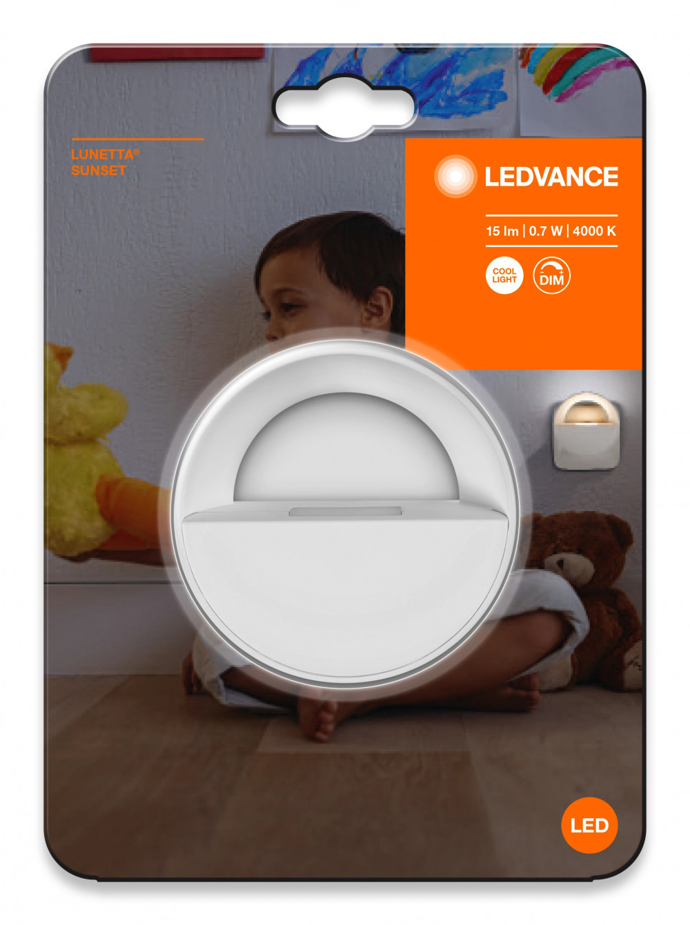 A(z) LEDVANCE LUNETTA SUNSET beltéri fehér éjszakai LED lámpa, 0,6 W fogyasztás mellett 15 lm fényerőt biztosít, alkonykapcsolóval ellátva, naplementehatás, naplemente-effektus.