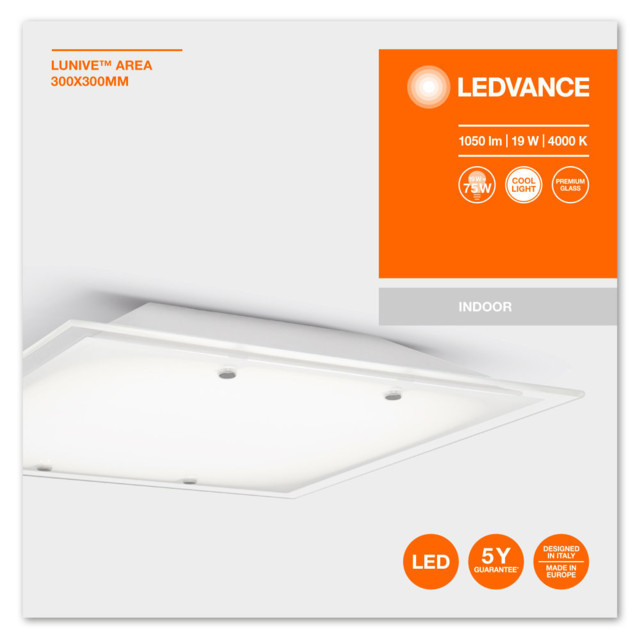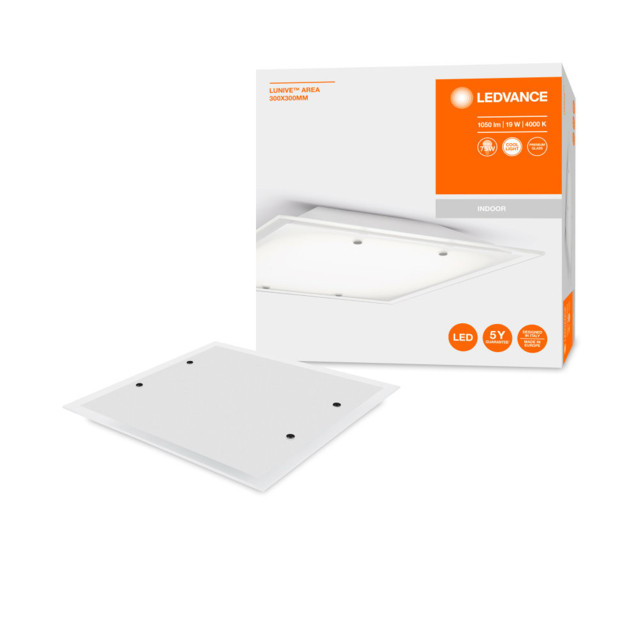 A LEDVANCE LEDVANCE LUNIVE Area 300x300, beltéri, fehér fali / mennyezeti lámpa, 19W, 4000K, 1050lm, IP20 egy világítási termék. 4000 K meleg fehér fényével.