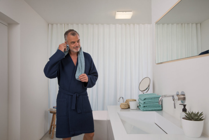 Nem, ez a termék IP20 védettségű – kizárólag száraz, beltéri használatra alkalmas (nappali, háló, iroda). Nem véd víz ellen, nedves helyiségben (fürdő, konyha mosogató felett) ne használja.