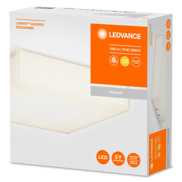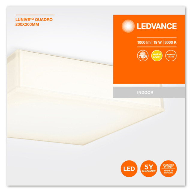 A LEDVANCE LEDVANCE LUNIVE Quadro 200x200, beltéri, fehér fali / mennyezeti lámpa, 19W, 3000K, 1050lm, IP20 egy világítási termék. 3000 K meleg fehér fényével.