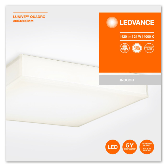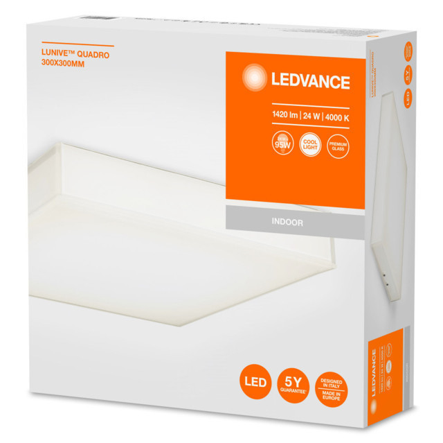 A LEDVANCE LEDVANCE LUNIVE Quadro 300x300, beltéri, fehér fali / mennyezeti lámpa, 24W, 4000K, 1520lm, IP20 egy világítási termék. 4000 K meleg fehér fényével.