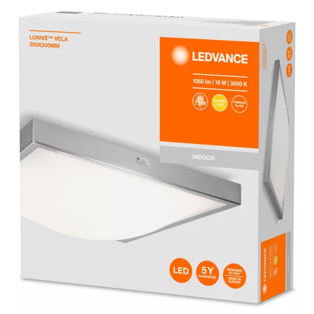 A LEDVANCE LEDVANCE beltéri mennyezeti lámpa, 19W, 1050lm, 3000K, IP20, méret: 300x300mm egy világítási termék. 3000 K meleg fehér fényével.