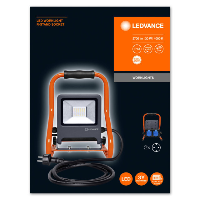 A(z) LEDVANCE WORKLIGHTS R-STAND SOCKET munkalámpa sötétszürke színben, 30 W fogyasztás mellett 2700 lm fényerőt biztosít, természetes fehér fénnyel, 232 mm hosszúsággal, IP44 védelemmel.