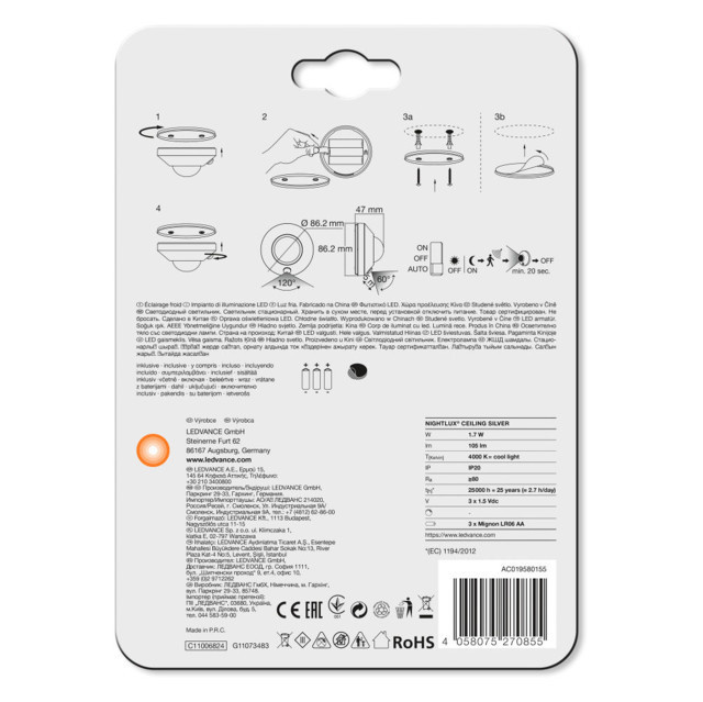 LEDVANCE NIGHTLUX Ceiling Silver, beltéri, ezüst átmérő: 86mmjű, ezüst mennyezeti éjszakai irányfény mozgásérzékelővel, 3xAAA elemmel, 1.7W, IP20, 4000K, 105lm