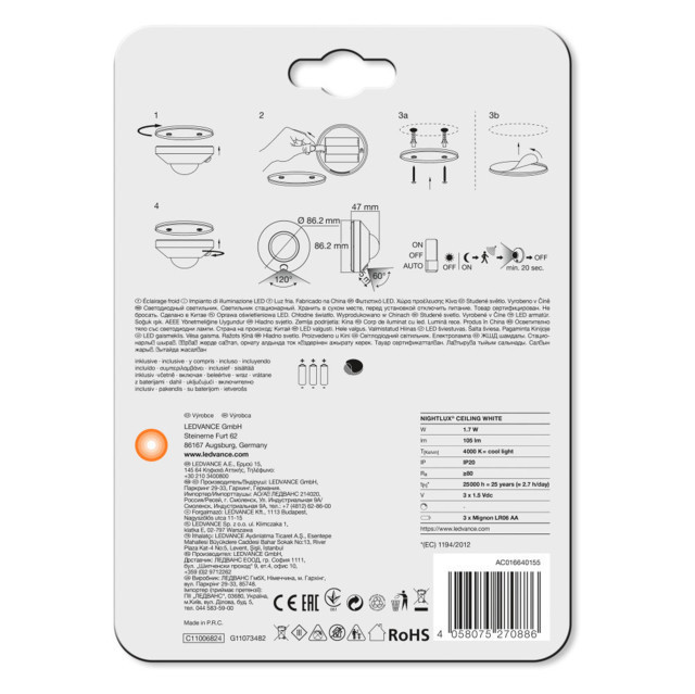 A LEDVANCE LEDVANCE NIGHTLUX Ceiling White, beltéri, fehér átmérő: 86mmjű, ezüst mennyezeti éjszakai irányfény mozgásérzékelővel, 3xAAA elemmel, 1.7W, IP20, 4000K, 105lm egy lámpatest. 4000 K meleg fehér fényével.