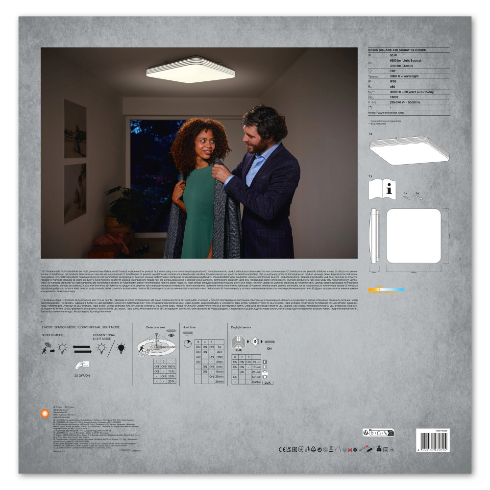 A(z) LEDVANCE ORBIS CLICK SENSOR mozgásérzékelős beltéri kerek mennyezeti lámpa fehér színben, 50 W fogyasztás mellett 3700 lm fényerőt biztosít, beépített mozgásérzékelővel, meleg fehér fénnyel.