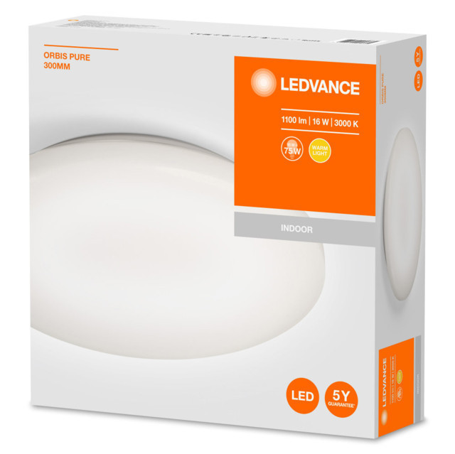 A LEDVANCE LEDVANCE ORBIS Pure, beltéri, fehér kerek mennyezeti lámpa, 16W, 3000K, 1100lm, IP20 egy világítási termék. 3000 K meleg fehér fényével.