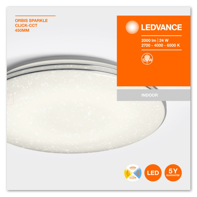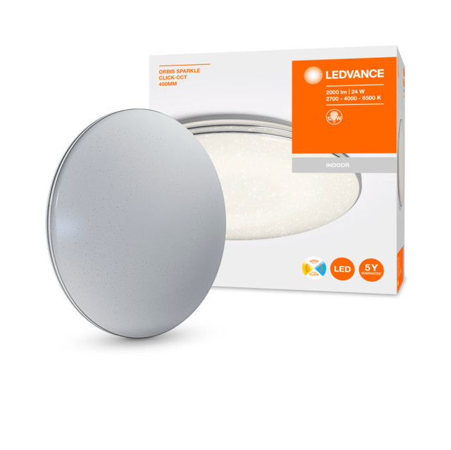 A LEDVANCE LEDVANCE ORBIS Sparkle CLICK-CCT, beltéri, fehér kerek mennyezeti lámpa, 24W, 2700-6500K, 2000lm, IP20 egy világítási termék. 2700…6500 K (változtatható) fényével.