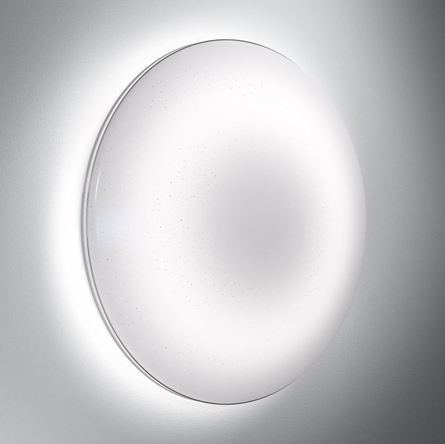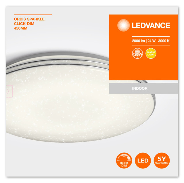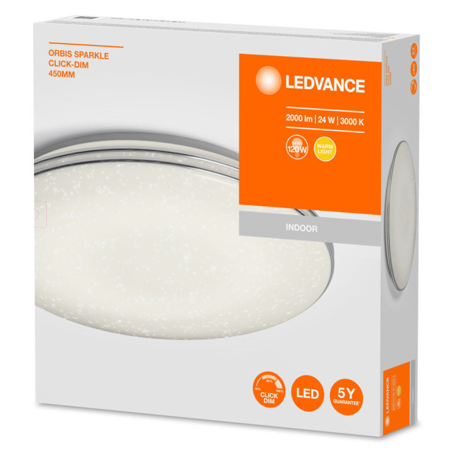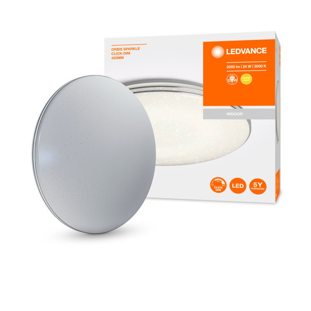A LEDVANCE LEDVANCE ORBIS Sparkle CLICK-DIM, beltéri, fehér kerek mennyezeti lámpa, 24W, 3000K, 2000lm, IP20 egy világítási termék. 3000 K meleg fehér fényével.