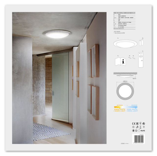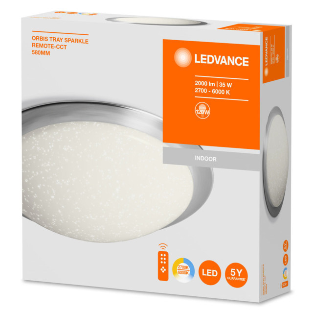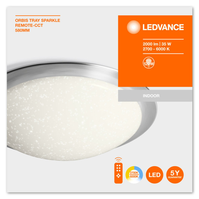 A LEDVANCE LEDVANCE ORBIS Tray Sparkle REMOTE-CCT, beltéri, fehér kerek mennyezeti lámpa, 35W, 2700-6500K, 2000lm, IP20 egy világítási termék. 2700…6500 K (változtatható) fényével.