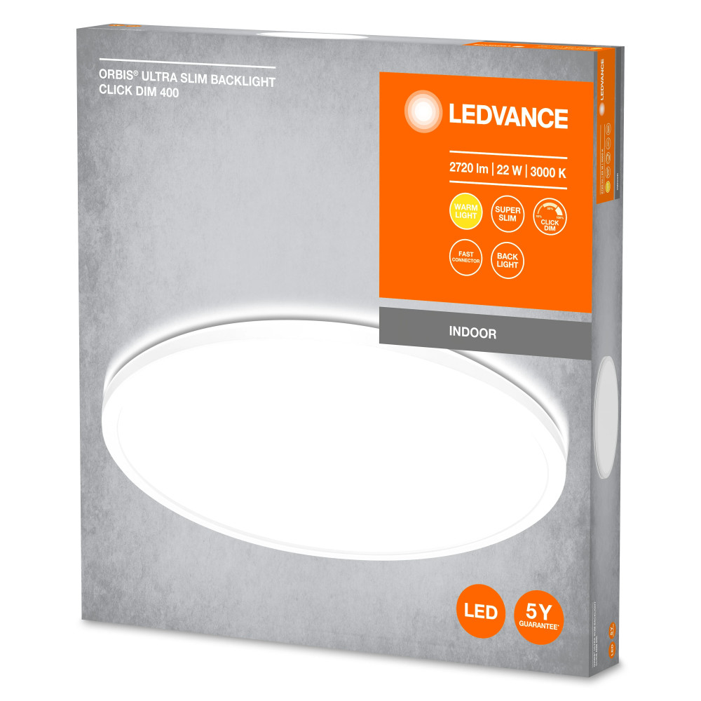 A(z) LEDVANCE ORBIS ULTRA SLIM CLICK DIM beltéri kerek mennyezeti lámpatest fehér színben, 22 W fogyasztás mellett 1850 lm fényerőt biztosít, ultra vékony (27 mm) kialakítással, Click DIM fényerő-szabályozással.