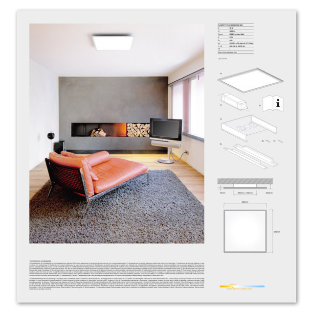 A LEDVANCE LEDVANCE PLANON Plus LED panel 600x600mm beltéri felületre szerelhető, fehér, 3200lm, 36W, IP20, 3000K egy LED panel. 3000 K meleg fehér fényével.
