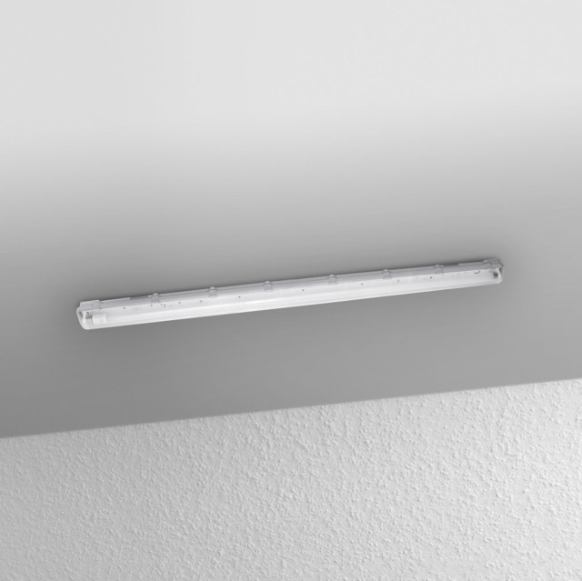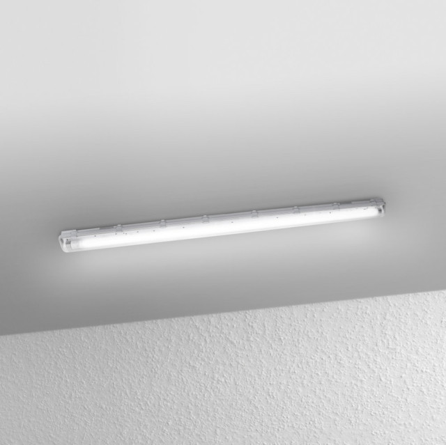 A LEDVANCE LEDVANCE SUBMARINE 1X19W 150 4000K, beltéri, szürke Por- és páramentes mennyezeti lámpa, 19W, 4000K, 1800lm, IP65, G13 egy világítási termék. 4000 K meleg fehér fényével, 19 W teljesítménnyel és 1800 lm fényárammal.
