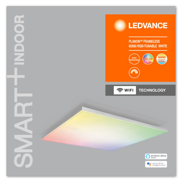 A LEDVANCE LEDVANCE SMART+ WIFI PLANON RGB LED panel 600x600mm beltéri felületre szerelhető, fehér, 3400lm, 40W, IP20, változtatható színhőmérséklet, RGB, hangvezérelhető egy WiFi-kompatibilis LED panel..