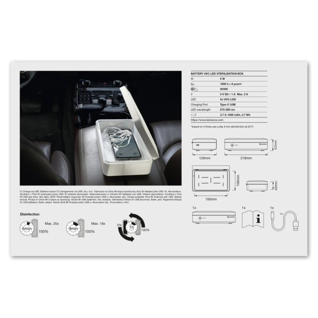 A LEDVANCE LEDVANCE fertőtlenítő UV-C doboz, akkumulátoros, zárt rendszerű, kisebb tárgyak mobil telefon, szemüveg, kulcsok-fertőtlenítésére, 219*126*átmérő: 63mm 5V 1A TYPE C USB mindennapos használatra. egy világítási termék..