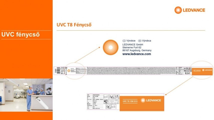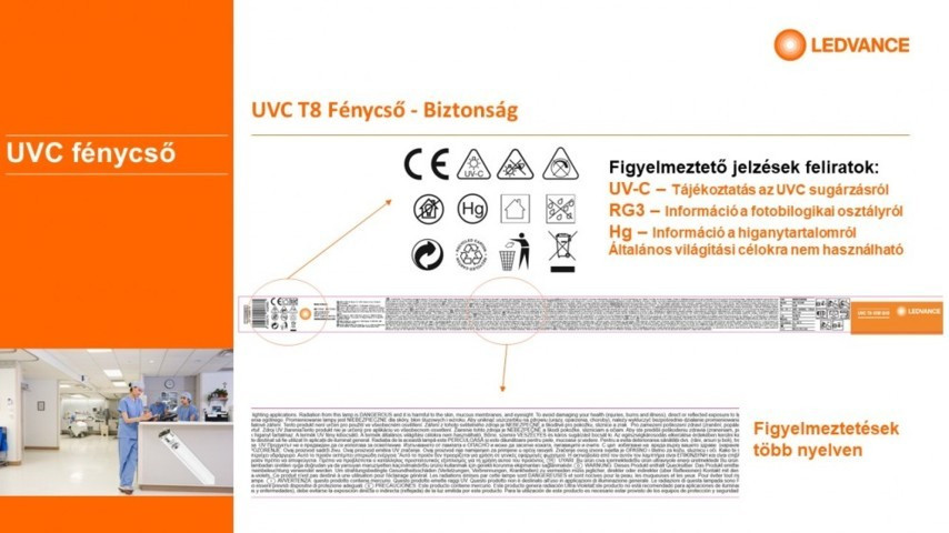 A LEDVANCE LEDVANCE T8 UVC 15W-os fénycső, BAKTERICID (GERMICID) hatással, G13-as foglalattal, 10 800 óra, ózon mentes kivitel, kimenő UVC: 0,53 W/m2 @1000mm egy LED fénycső..
