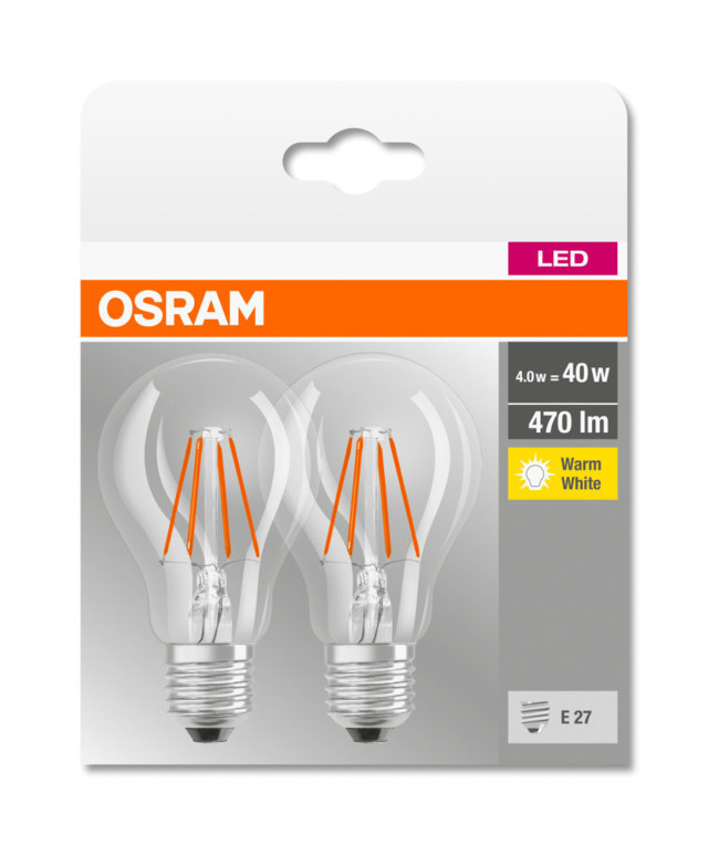 OSRAM Base LED fényforrás (izzó) körte forma átlátszó üveg búra, E27 foglalat, 4W, 470lm, 2700K meleg fehér 2db-os csomag