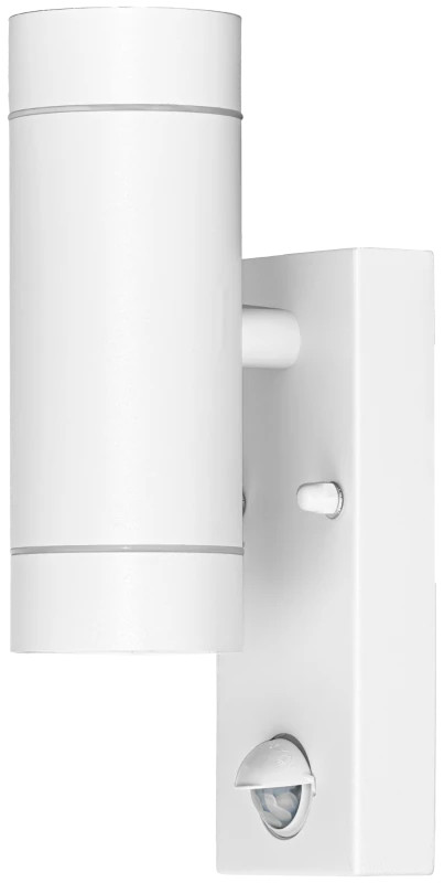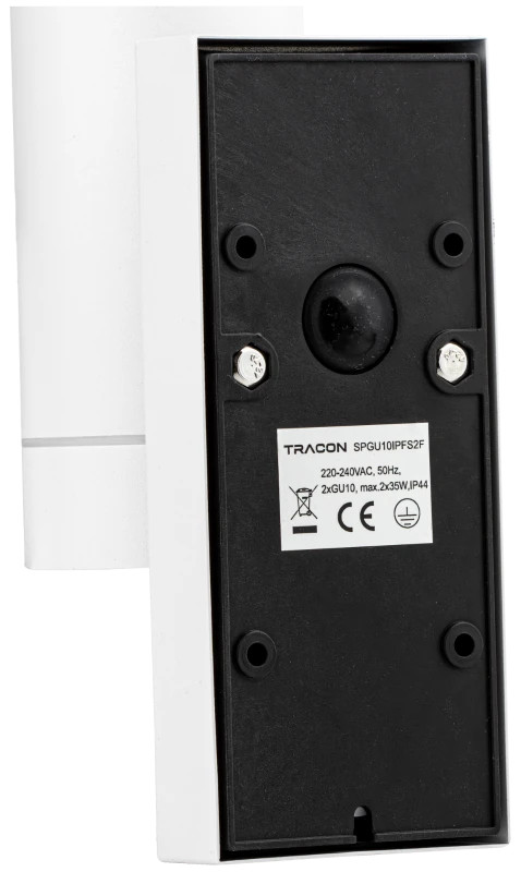 Tracon SPGU10IPFS2F Oldalfali spot lámpatest mozgásérzékelővel, kültéri, fehér 100-240VAC,50Hz,2xGU10,max35W,10s-4min,max 8m,3-2000lx,IP44