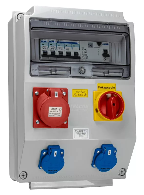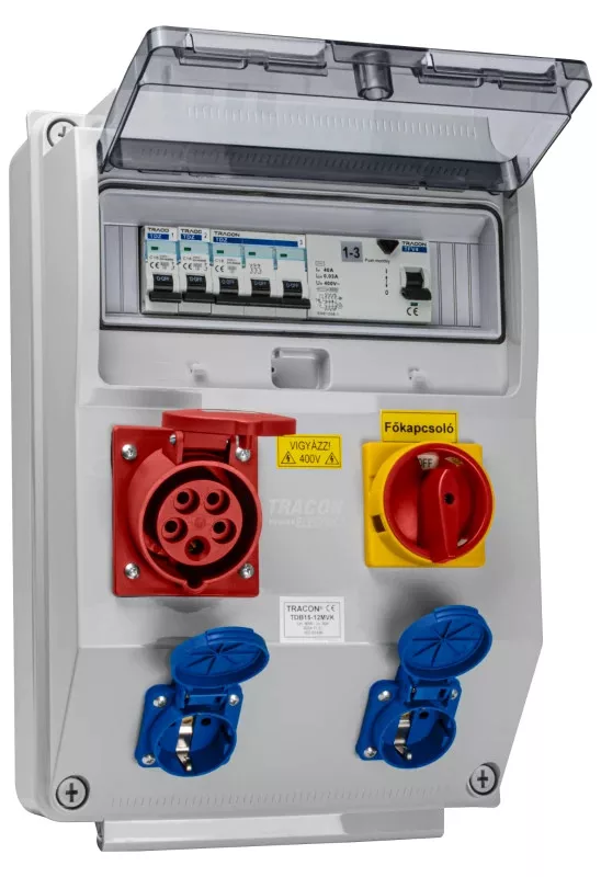 Tracon TDB15-12MVK Csatlakozó doboz védelemmel,főkapcs.,vezetékezett,készre sz. Prot.:RCCB,MCB,Out:2×SCHUKO+1×16A(3P+N+E)